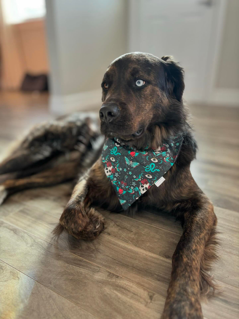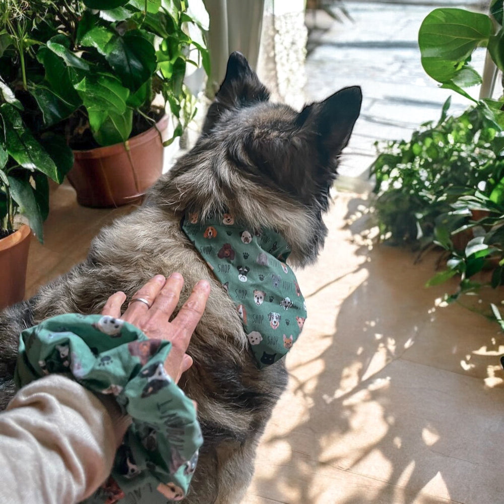 Browse our selection of stylish over-the-collar pet bandanas and matching hair scrunchies.