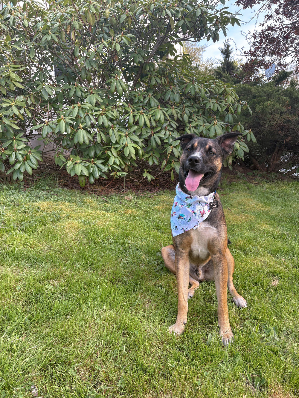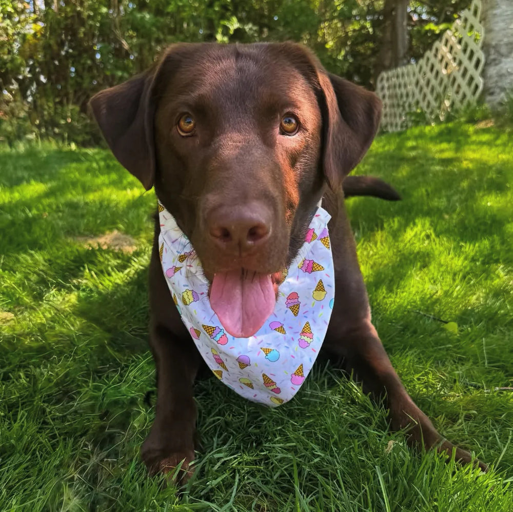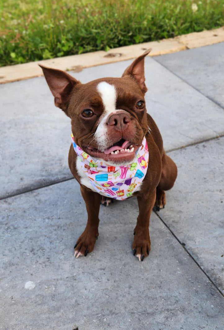 Our bandanas are over-the-collar style and slide onto your pet’s collar — they don’t wrap around the neck.